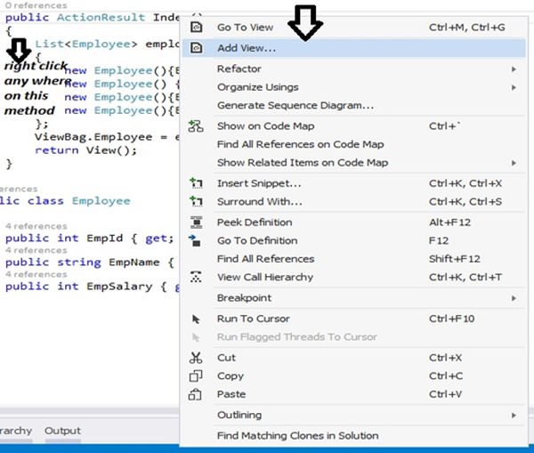 Step 3: Now our controller action method is ready so we need to create a view that will collect the list of Employees and render output like above. For adding a view right click anywhere on the controller action method and select add view.