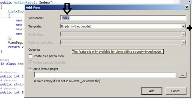 Step 4: Remember view name should be same as the controller action method. So do not change the view name after that select empty(without model) from Template. And click on Add.