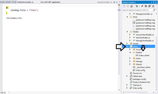 Step 5: When you click on add a view has been added to Views folder. Go to View folder that you will find a folder that will match the name of the controller in our case controller name is Default. Click Default folder and expend it then you will find a view Index.cshtml.