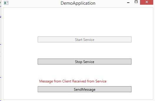 Create a separate project named AppUI and add a WPF application. It would hold three buttons, one to start the service, the other to stop the service and the last one to send a message to the service and a label that is updated when the service echoes back the message sent from the client. The application would look as in the following: