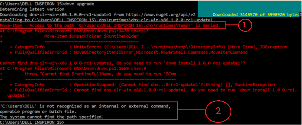 While running “dnvm upgrade” command it was saying that “Access to the path ~\.dnx\runtime\temp\” is denied.
