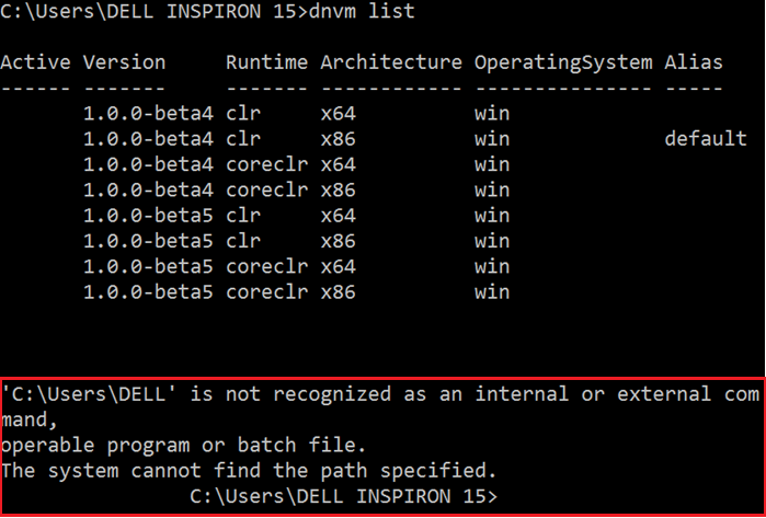 I was running any command of DNVM it was displaying the same error message. In the following screenshot I ran command “dnvm list” and get the same exception,