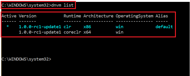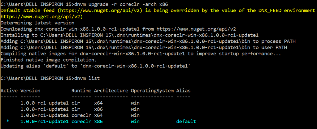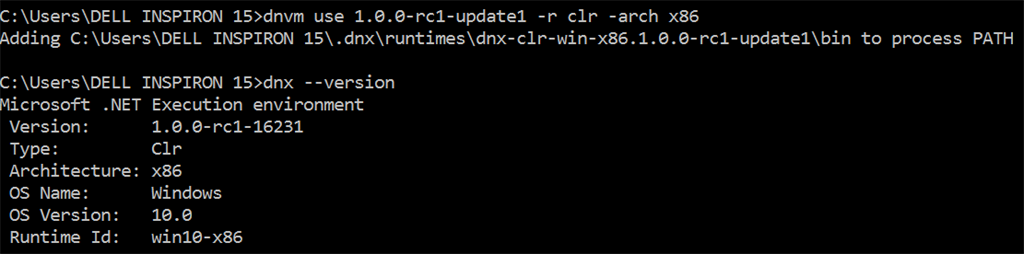 - dnvm use 1.0.0-rc1-update1 -r coreclr -arch x64 -p.