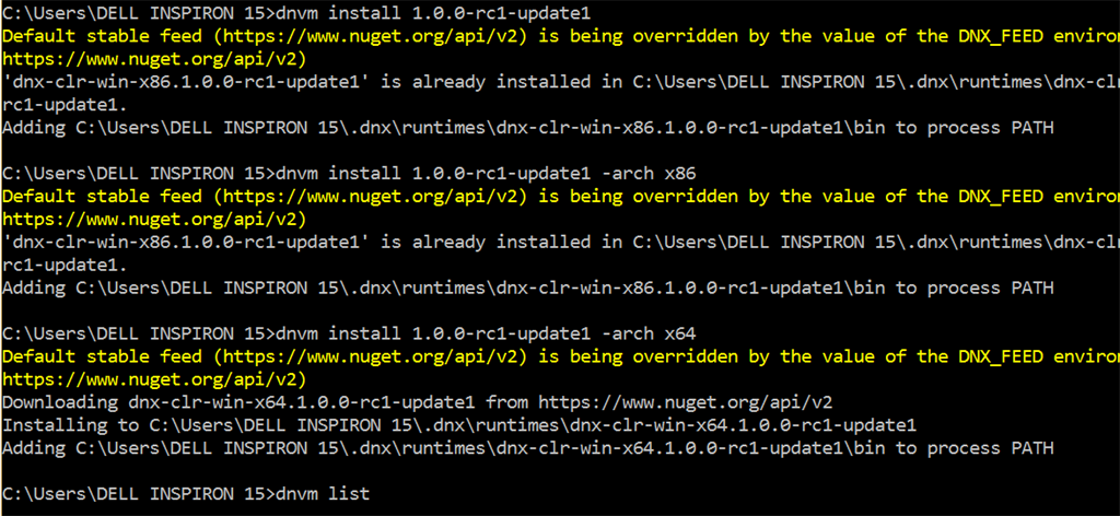 After that I ran the command dnvm list to see the list of installed dnx runtime versions.