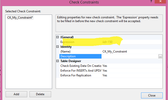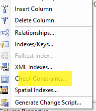 First go to Table Design then right-click on the Column_Name that will contain a check constraint and select the “Check Constraint” option then a new window will be shown. In this window add a constraint and provide its definition in the Expression Field.