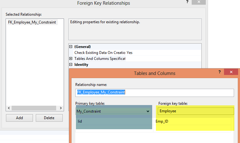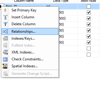 First go to table design than right-click on the column and select the “Relationship” option. Now a window will be shown. In this window click on the “Table and Column Specificat” option and select Primary Key table, Column name and Column name for foreign key.