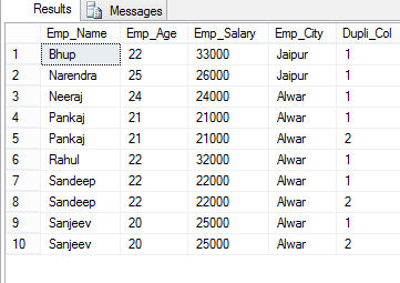 ( SELECT *, ROW_NUMBER() OVER( PARTITION by Emp_Name, Emp_Age, Emp_Salary, Emp_City ORDER BY Emp_Name ) AS Dupli_Col