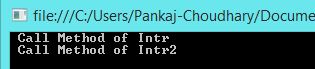 The preceding program compiles and runs successfully to produce the desired output. Inside Main() we have an interface reference Intrf of type interface Intr. We also have a reference of the class Demo2 as Dmref. The reference of object of class Demo2 is stored in Intrf and the method of class Demo2 is invoked using Intrf.