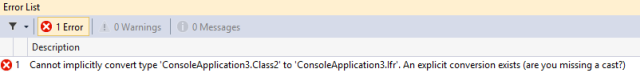 When we run the preceding program it will throw an error. Because Class2 does not inherit the interface but it wants to access the methods of the interface. Suppose we have a large collection of classes then it is difficult to identify which class inherits an interface. For this purpose we can use the “Is” operator.