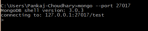 Now we connect a mongod instance using a mongo shell. Open another command prompt and execute the command “mongo –-port Port_Number”. Port_Number specifies the instance to connect to. We can choose any port number among 27017,27018,27019. Here I selected port number 27017.