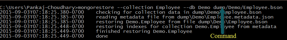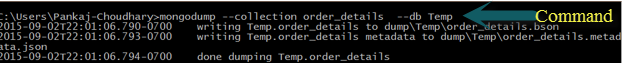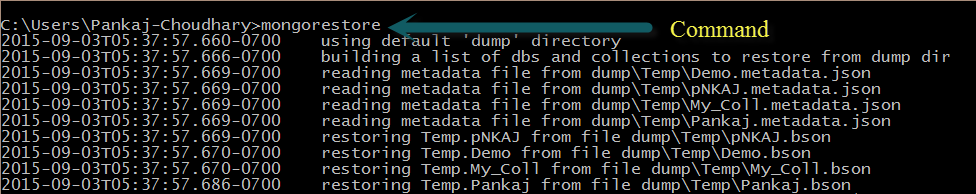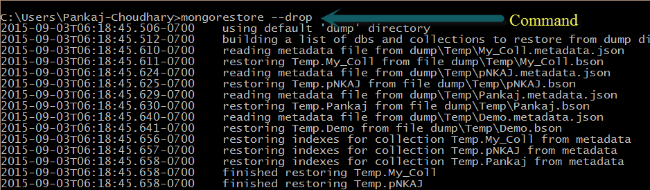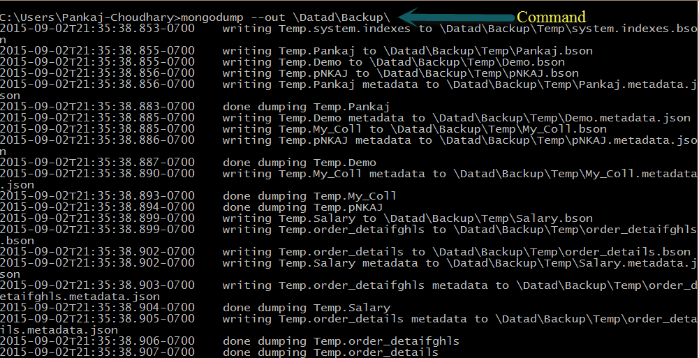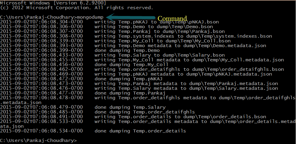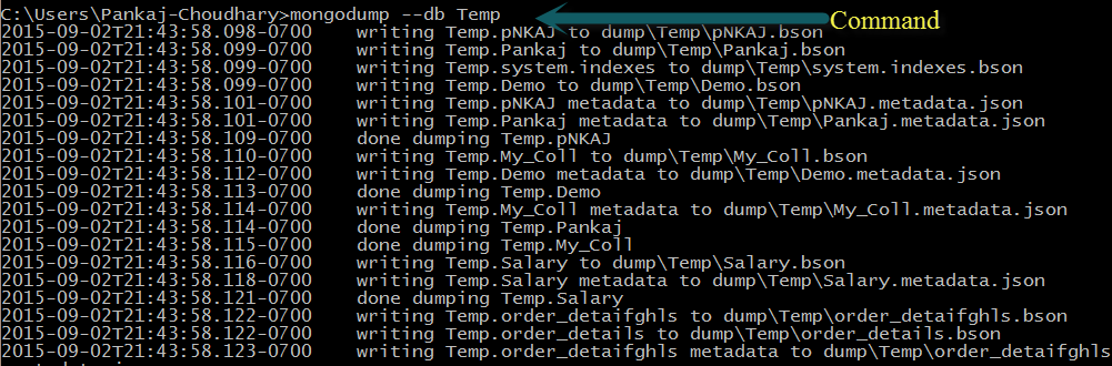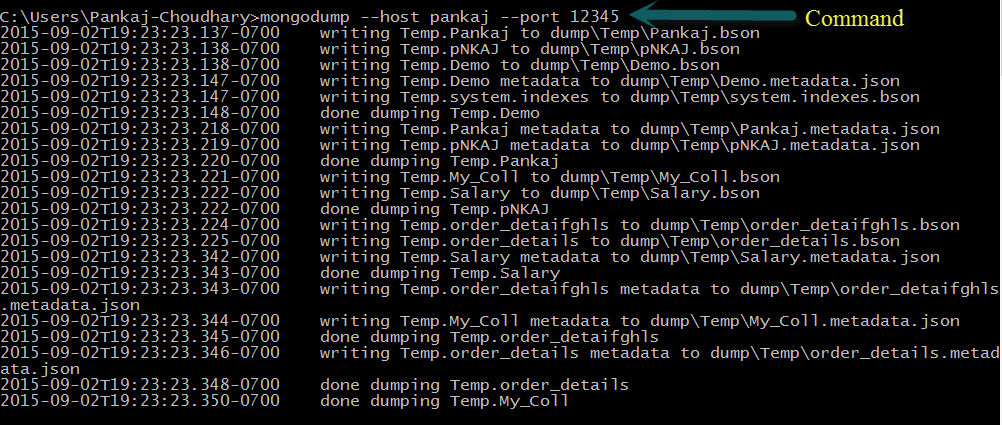 In above example we run a “mongodump” command, this command created the backup of all the database and stored in “C:\users\Pankaj-Choudhary” directory with “dump” named.