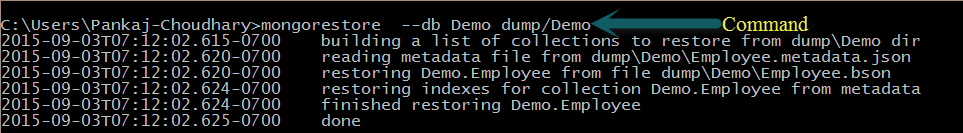 Syntax mongorestore --db DataBase_Name Path Example- mongorestore --db Demo dump/Demo