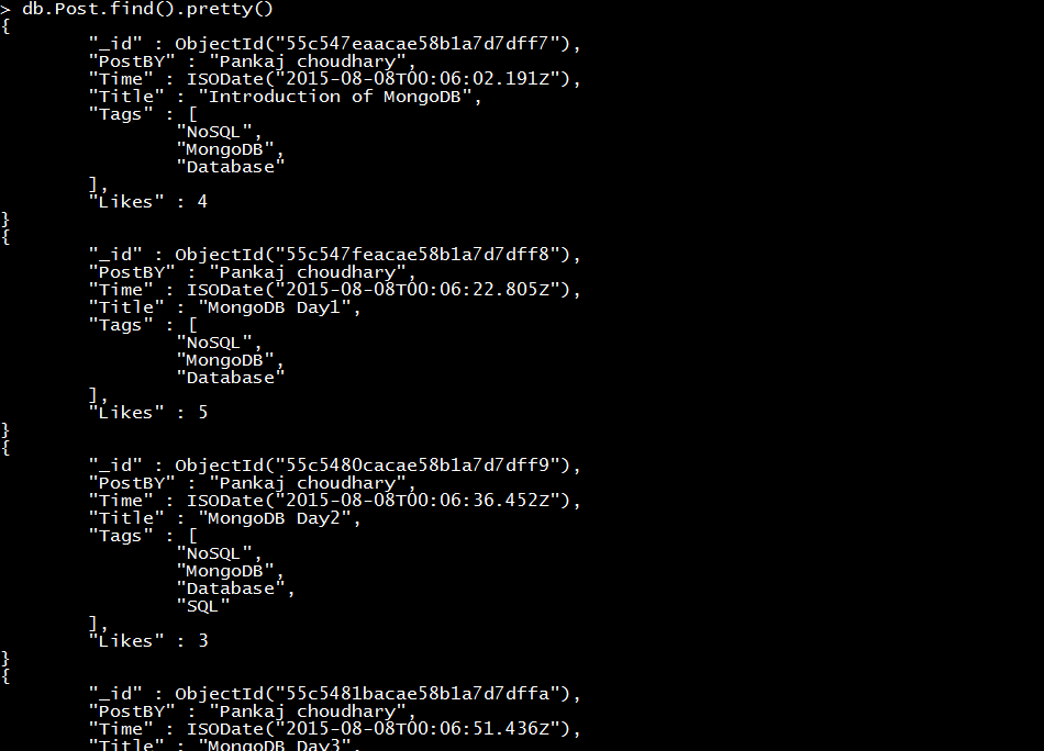 - db.Post.find({Title:"MongoDB-Day11"}).pretty()