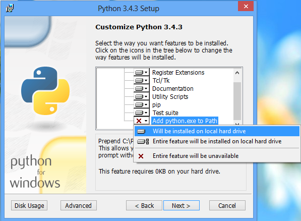 Now go to “Add python.exe to Path” option and select “Will be installed on  local hard drive” option and press “Next.”
