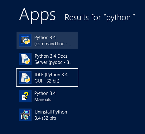 To start the GUI mode press “Start” and type “Python” and select “IDLE(Python  3.4 GUI)” option.