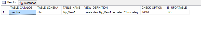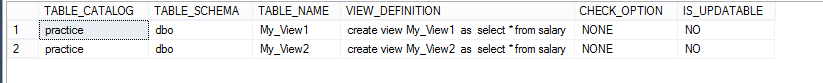 INFORMATION_SCHEMA.VIEWS:This Information_Schema returns all the views present in the current database. This system view is used to find all the information about all or a specific view of the specific database. This query returns View_Name, View_Definition, Check_Option and the updateability of the View.