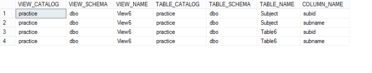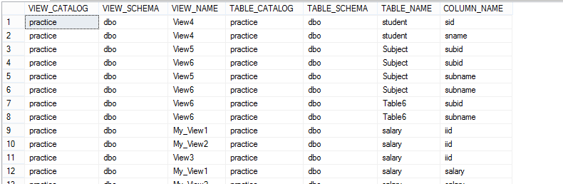 INFORMATION_SCHEMA.VIEW_COLUMN_USAGE:This Information_Schema is used to find all the columns present in a view. In other words, if we want to find which columns or which tables are used in a View then we can use the VIEW_COLUMNS_USAGE System_View . It returns all the tables and columns of each table present in the view.