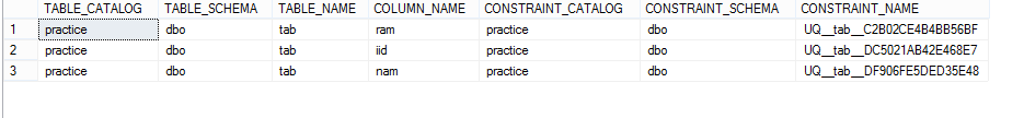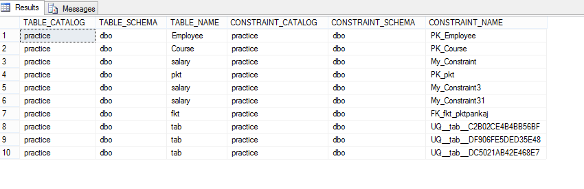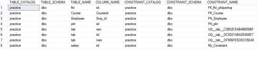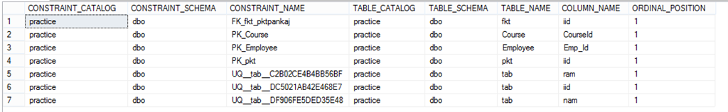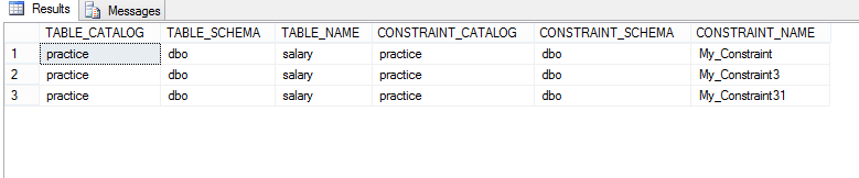 INFORMATION_SCHEMA.CONSTRAINT_TABLE_USAGEThis system view returns information about a table that contains any type of constraint. This Information_Schema is used when we want to find all the constraint used by a table. This query returns Table_Name and Constraint_Name but doesn't return Column_Name.