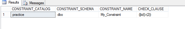 - select CONSTRAINT_CATALOG,CONSTRAINT_SCHEMA,CONSTRAINT_NAME,CHECK_CLAUSE from INFORMATION_SCHEMA.CHECK_CONSTRAINTS