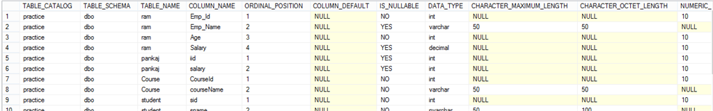 INFORMATION_SCHEMA.COLUMNSThe Columns method gets the details about the columns of a table. This method returns the information about the table_name, the column_name, the position of the column in the table , the default value of the column, the data_type, the maximum character length and other information.