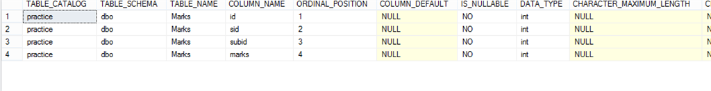 - Where TABLE_NAME='Marks' and DATA_TYPE ='int'