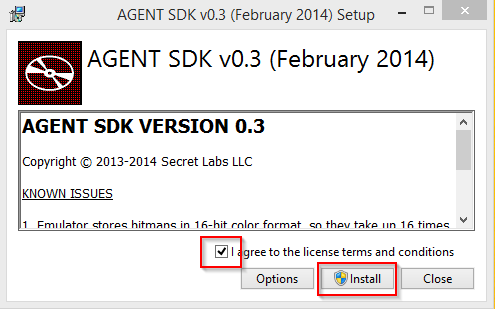 The AGENT SDK v0.3 Setup will open and then select checkbox license terms and click Install button.