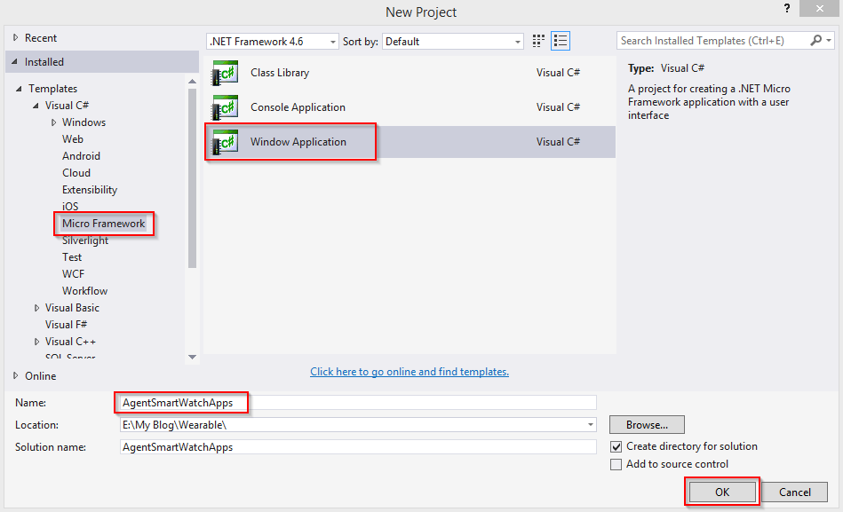Open Visual Studio 2015 and go to file menu and point new and then click new project, where you can see the section Visual C# Template. Click Micro Framework, then select Window Application and type Project Name AgentSmartWatchApps. Choose the project location path and then click OK button.
