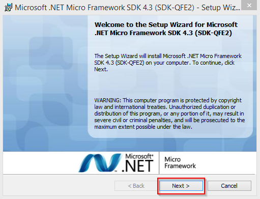 The Microsoft .NET Micro Framework SDK 4.3 setup wizard IS open and click