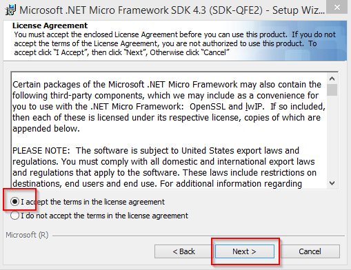 The Microsoft .NET Micro Framework SDK 4.3 setup wizard is open now. Select checkbox for license terms and click