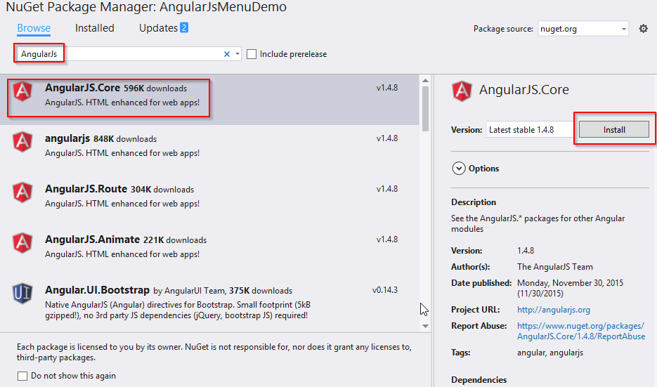 NuGet Package Manager window will open and you can type AngularJS and browse. Also select AngularJS.Core and click Install button