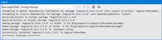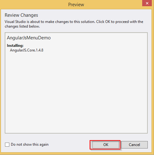 Preview window will open and you can see the AngularJS version installing details and click OK button. After it is successfully installed in AngularJS, you can see the following,