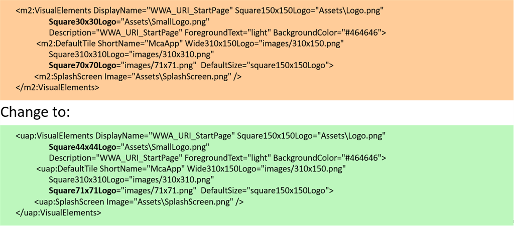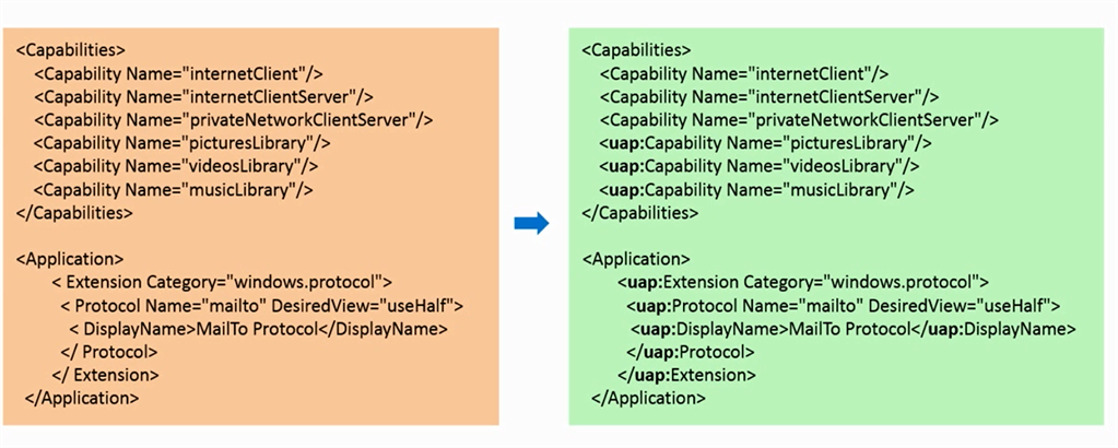 Make some edits in package.appxmanifest by adding uap: before some capabilities and Application Extensions and Protocols as shown below: