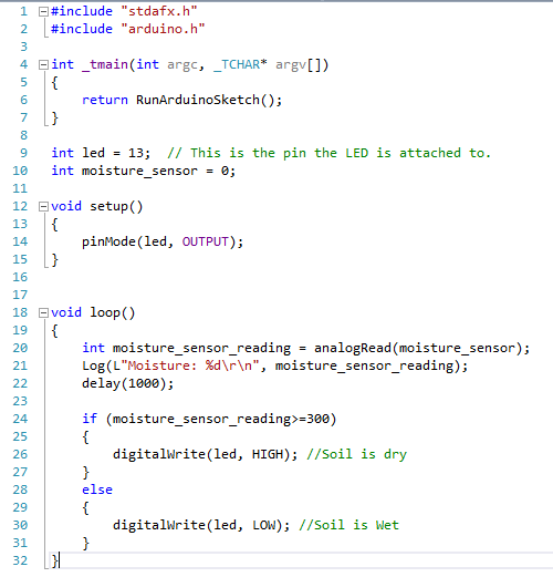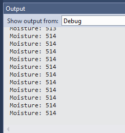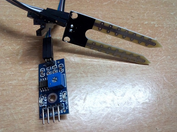 Depending on the code, the sensor data is received by the A0 pin. However any analog I/O pin can do the task. My sensor was showing values above 300 when the soil is moist and above 500 when it is completely dry but when I place it in water the values drops to 100. Here I have attached an LED to alert us when the soil becomes dry or you can do something else with your Advanced Gardening System to alert you that the plant needs water. Also I have noticed that different sensors give different values. So perhaps the values for Dry, Moist and Wet soil will be different from mine but you can always play with the values and tabulate them. After a few samples you can finally determine the values for each condition of moisture with your sensor.