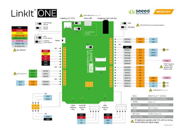 The new IoT board LinkIt ONE co-designed by Mediatek and Seed Studios is an open source, high performance board for prototyping Wearables and IoT devices. It is a small board based on SoC that comes with onboard Wi-Fi, GSM and GPRS that makes it a powerful board for connected devices. The pin layout of the board is exactly similar to Arduino, making the development easy with many Arduino compatible shields and sensors. It comes at an affordable price of $ 59, you can get it from here. Let’s have a look on its features-