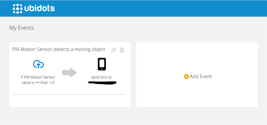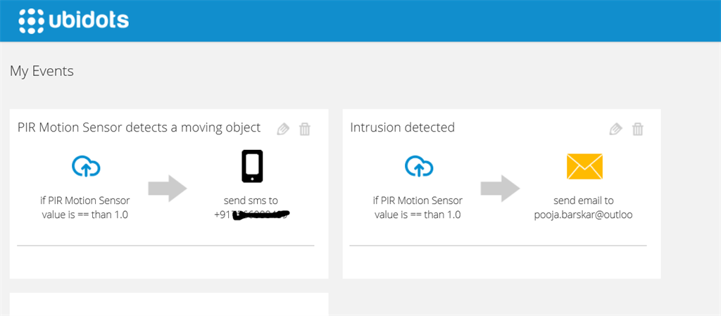 - SMS event will be added with PIR sensor value equals to 1. Similar way you can add an Email trigger.