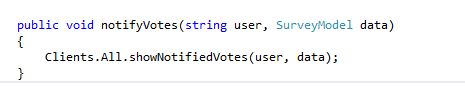 The sender needs to call the server method of the hub class with the data that is to be sent to the clients. This is done in an event handler that should trigger this broadcast. In our case that would be the Vote button click handler. So here goes the code for that.