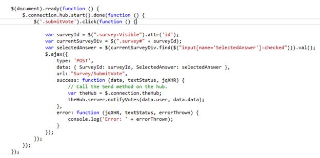 So we define the handler for the submit vote button. An important thing to remember is the handler must be registered after the connection start method of the hub is "done" or succeeded. So the jQuery click handler is put in the callback function of the start method. As the ajax POST request that updates the votes in SharePoint list succeeds, the server method in the hub is called with the Id of the survey that was updated and the user who updated it.
