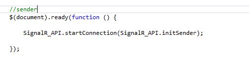 Just to have the SignalR code in one place instead of scattering it over multiple views, I added one JavaScript file, SignalR.API.js, with 3 methods.InitReceiver: contains the receiver's code. Called in the doc.ready event handler of the receiver.InitSender: contains the event handler for the submit vote button.StartConnection(callback): starts a connection and accepts a callback function that is called in the "done" success handler of the start method. Here is how the sender and receiver code looks like now.![]()