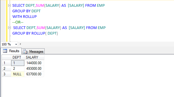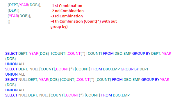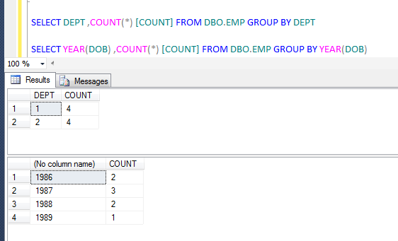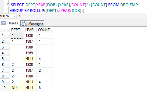 - SELECT DEPT,GROUPING(DEPT) GRP_DEPT,YEAR(DOB) [YEAR],GROUPING(YEAR(DOB)) GRP_YEAR ,COUNT(*) [COUNT] FROM DBO.EMP