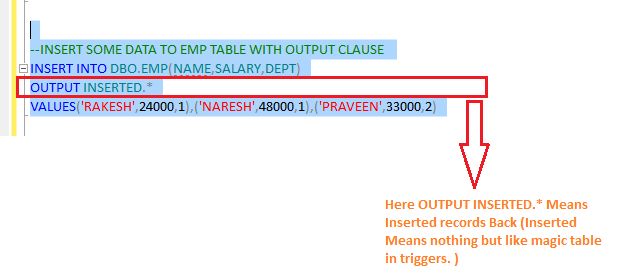 - OUTPUT INSERTED.ID,INSERTED.NAME,INSERTED.DEPT