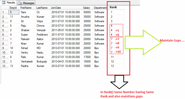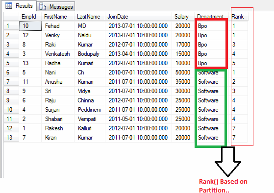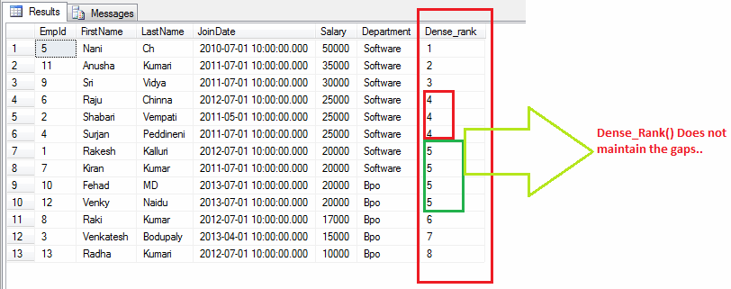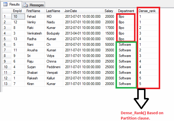 - DENSE_RANK() OVER ([PARTITION BY CLAUSE] <ORDER BY CLUASE >): Returns rank for rows within the partition of result set.With out any gaps in the ranking.