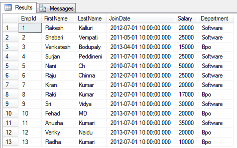 - insert into Employee(FirstName,LastName,JoinDate,Salary,Department)values('Rakesh','Kalluri','2012-07-01 10:00:00.000',20000,'Software')
