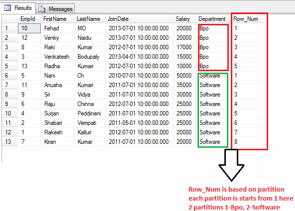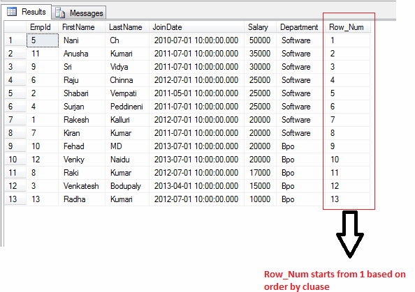 - ROW_NUMBER() OVER ([PARTITION BY CLAUSE] <ORDER BY CLUASE>): Returns the sequantial number of a row within the a partition of result set at 1 for the first row of the each partition.
