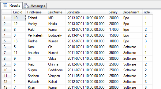 - select * ,ntile(3) over (partition by De6partment order by Salary desc) as [ntile] from Employee