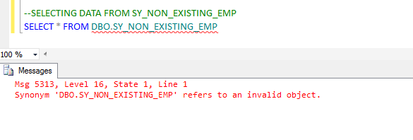 When we run the preceding code the command is completed successfully, but the referenced object does not exist in the database. This is because of the late-binding behavior of synonyms. The advantage of synonyms is that we can use a single synonym for many objects, in other words in the preceding example we created a synonym for a non-existing object later and we create that object name with either a table object, view object, function object and procedure object and so on.