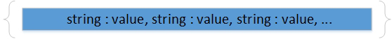 An object is simply an unordered list of name/value pairs surrounded by curly brackets "{}". Each name/value pair is divided by a colon ":" and the name/value pairs are separated by a comma "," from each other.