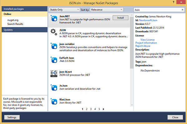 We use the search feature and type “json” into the textbox in the upper-right corner. After a short while, the list is populated with all the JSON related libraries. We choose "Json.NET" and hit the Install button.