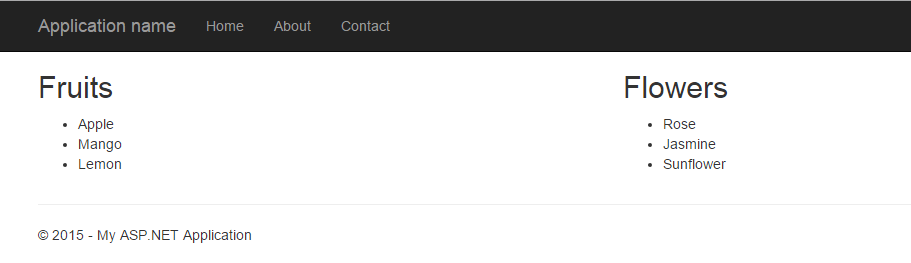 To get started, open Visual Studio 2013 and create a brand new ASP.NET MVC application. Assume we need to display a list of fruits and flowers. To do this let`s add the following code to the Index action of HomeController.