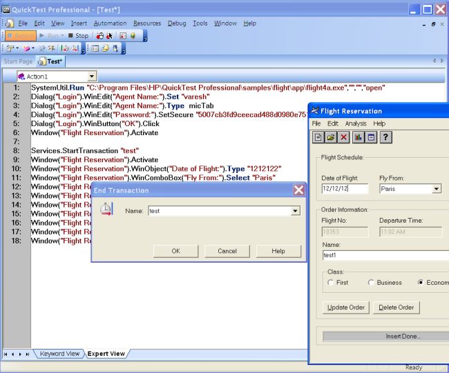 You can measure how long it takes to run a section of your test by defining transactions. A transaction represents a process in your application that you are interested in measuring. You define transactions within your test by enclosing the appropriate sections of the test with start and end transaction statements. For example, you can define a transaction that measures how long it takes to reserve a seat on a flight and for the confirmation to be displayed on the client's terminal.A transaction can be inserted anywhere in your test, but must start and end within the same action.During the test run, the Start Transaction signals the beginning of the time measurement. The time measurement continues until the End Transaction is encountered. The test report displays the time it took to perform the transaction.There is no limit to the number of transactions that can be added to a test. You can also insert a transaction within a transaction.Part of a sample test with a transaction is shown below, as it is displayed in the Keyword View:The same part of the test is displayed in the Expert View as follows: