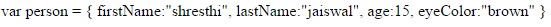 - var person = { firstName:"shresthi", lastName:"jaiswal", age:15, eyeColor:"brown" }